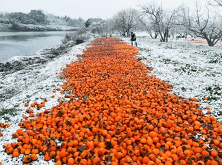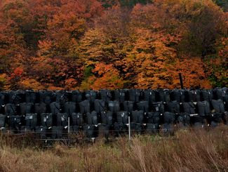 The project name was inspired by these two images (below). The first shows a persimmon contaminated with radioactive material. The second contains containers containing contaminated soil. Although they were placed in containers to keep people safe, there was no place to store the containers themselves. As a result, huge amounts of this plastic-packed soil have taken over many fields and forests in the area. In addition, the word “blue” in Japanese means “immaturity.” We are talking about the immaturity of people who could not control atomic energy.